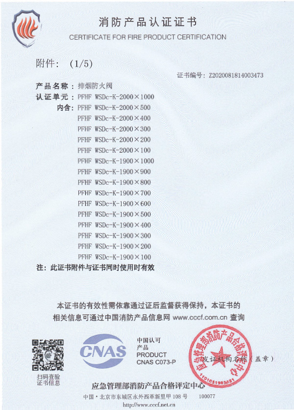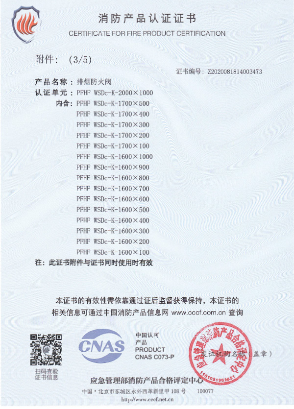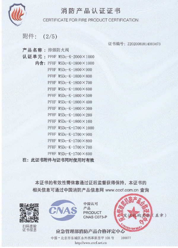 排煙防火閥認證證書2000X1000